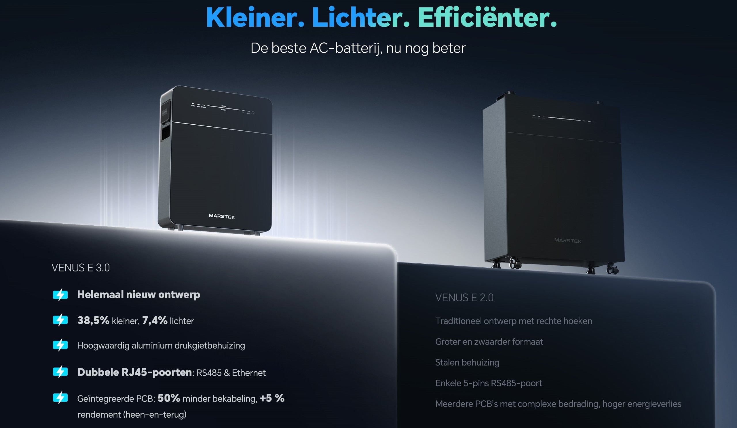 De Marstek Venus E3 is de nieuwste generatie binnen de populaire Venus-serie en vormt een duidelijke stap vooruit ten opzichte van de Venus E2. Het model is compacter, lichter en voorzien van verbeterde aansluitmogelijkheden voor een stabielere verbinding.